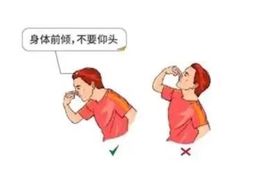 需要特别注意的是——大家通常会仰头、或者用餐巾纸塞住鼻孔,但这种方法是错误的,因为血流会经过鼻腔流入口腔,再到胃里,血会刺激胃粘膜引起恶心、呕吐。