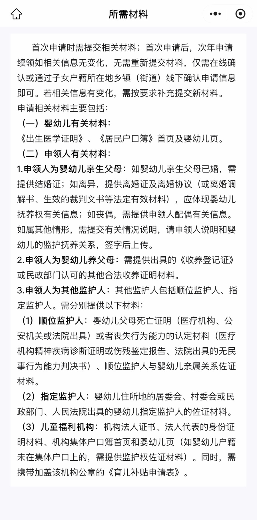 如果婴幼儿今年是第一次申请育儿补贴,可以提前准备好相关证件信息,点击“我要申请补贴”,填写相关信息,提交成功后等待工作人员审核即可。